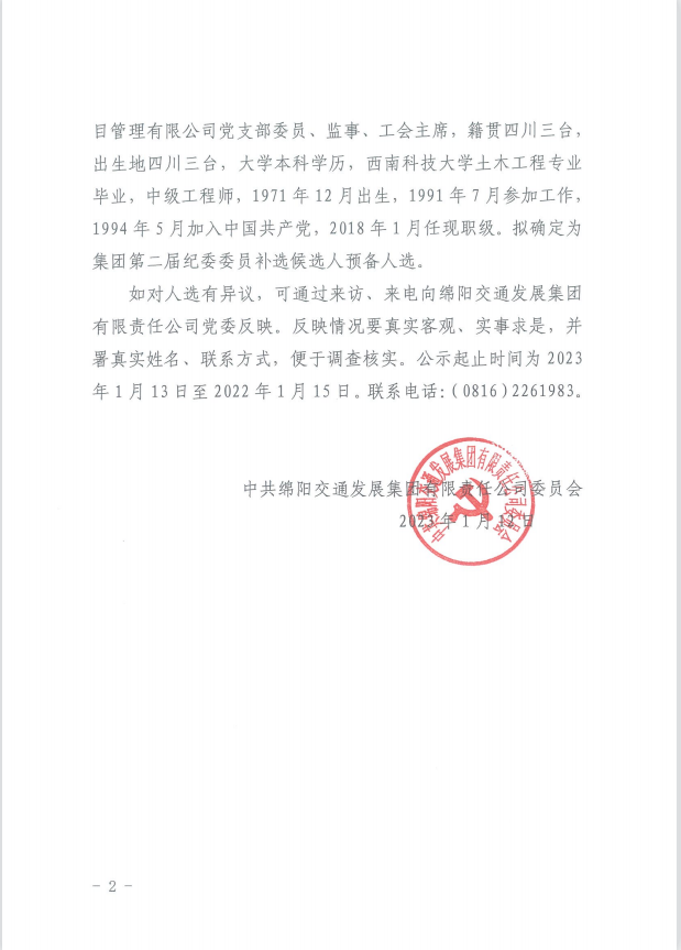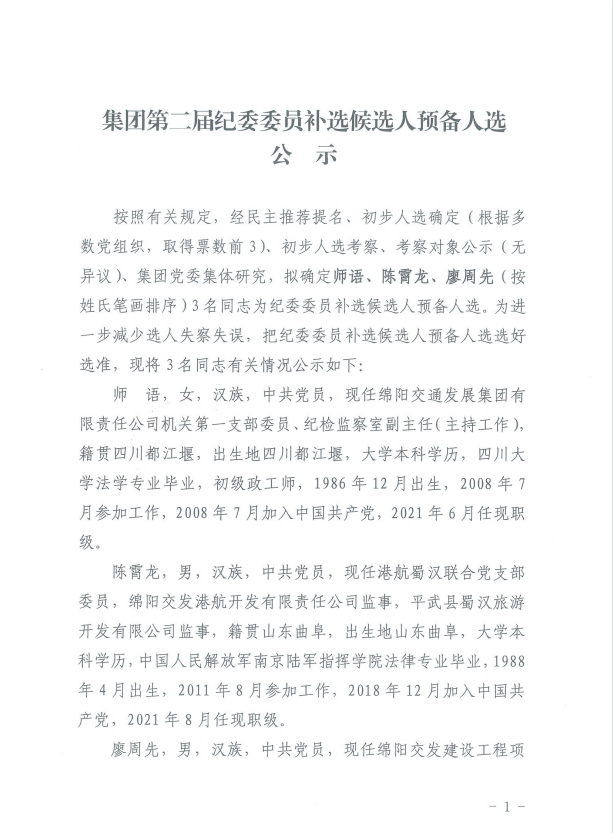 中拱綿陽交通發(fā)展集團有限責任公司委員會<關(guān)于進行集團第二屆紀委委員補選候選人預(yù)備人選公示的通知>