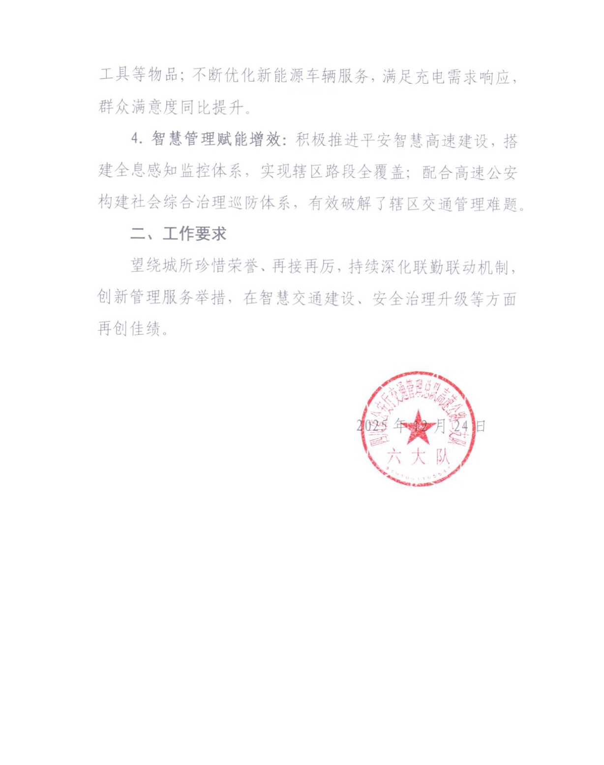 1月15日,高開(kāi)司收到來(lái)自四川省公安廳交通管理總隊(duì)高速公路二支隊(duì)六大隊(duì)的一封感謝信。信中對(duì)高開(kāi)司繞城高速2025年度“安全暢通、優(yōu)質(zhì)服務(wù)、智慧升級(jí)”核心目標(biāo),深度踐行“一路三方”聯(lián)勤聯(lián)動(dòng)與“五崗合一”工作機(jī)制,在轄區(qū)高速公路安全防控、保通保暢、服務(wù)提質(zhì)、科技賦能等工作中成效顯著,全年未發(fā)生一般程序道路交通事故,為區(qū)域高速公路管理樹(shù)立了先進(jìn)標(biāo)桿,給予高度贊譽(yù),對(duì)公司與高速公安攜手筑牢道路安全防線、全力保障公眾出行順暢的堅(jiān)實(shí)舉措表達(dá)誠(chéng)摯謝意,字里行間滿含認(rèn)可與期許。